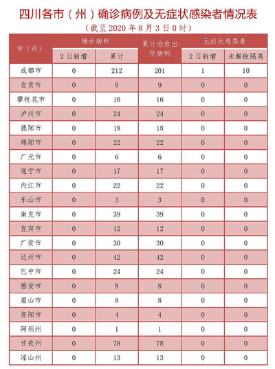 8月2日0-24时,四川无新增新型冠状病毒肺炎确诊病例,无新增治愈出院病例,无新增疑似病例,无新增死亡病例。