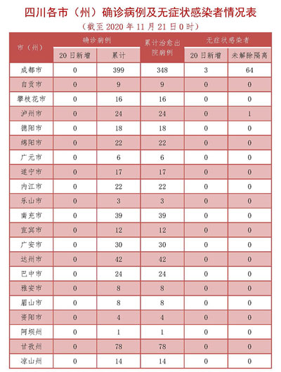 11月20日0-24时,四川无新增新型冠状病毒肺炎确诊病例,新增治愈出院病例1例,无新增疑似病例,无新增死亡病例。