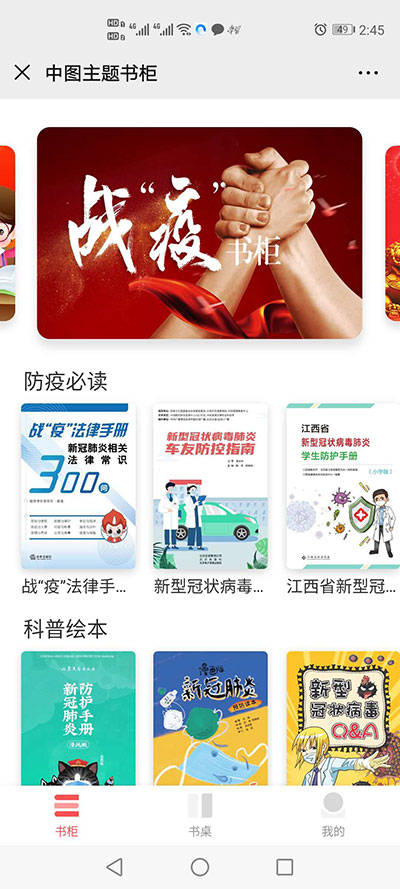 据了解,“战疫书柜”集合了全国30余家优秀出版单位的近50种优质数字内容,均为正版授权资源,数量仍在持续增加。其中,防疫专题图书包括预防指南、知识读本、心理防护手册、青少年绘本、科普音频等多种形式,满足各类群体的防疫知识“刚需”,帮助大家从成人防护、心理健康、儿童科普、医学等多种角度充分了解这一新型疾病。同时,读者在战“疫”书柜还可以阅读历史、社科、文学、医学等作品,丰富精神文化生活。“战疫书柜”还结合不同主题对书籍进行了归纳分类,包括“习近平的‘书柜’”“她书柜”“财富书柜”“世界好书书柜”“党建书柜”“青少年书柜”等专题。