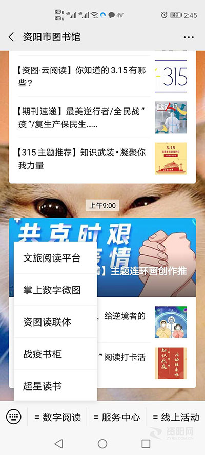 那么,怎样使用“战役书柜”呢?读者可以点开资阳市图书馆微信公众号菜单“数字阅读”,点击“战疫书柜”,进入页面后进行阅读。